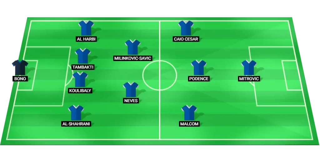 Al Hilal Lineup: Bono (GK), Koulibaly (DF), Tambakti (DF), Al-Shahrani (DF), Al Harbi (DF), Milinkovic-Savic (MF), Caio Cesar (MF), Malcom (MF), Neves (MF), Al-Dawsari (MF), Mitrovic (FW).