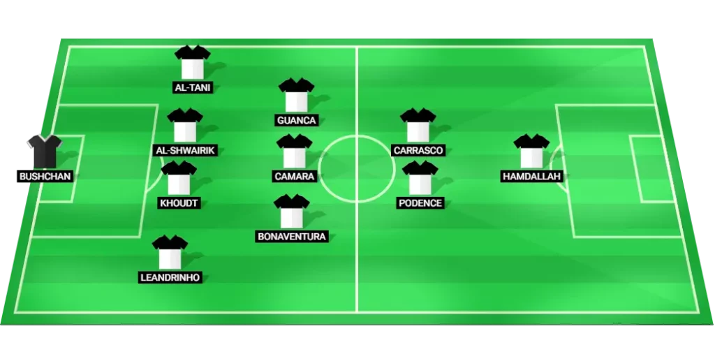 Al Shabab Lineup: Bushchan (GK), Al-Tani (DF), Leandrinho (DF), Khoudt (DF), Al-Shwairik (DF), Camara (MF), Guanca (MF), Bonaventura (MF), Carrasco (MF), Podence (MF), Hamdallah (FW).