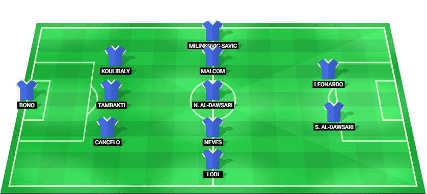 Bono (GK), Cancelo (DF), Tambakti (DF), Koulibaly (DF), Lodi (MF), Neves (MF), N. Al-Dawsari (MF), Malcom (MF), Milinkovic-Savic (MF), S. Al-Dawsari (FW), Leonardo (FW).