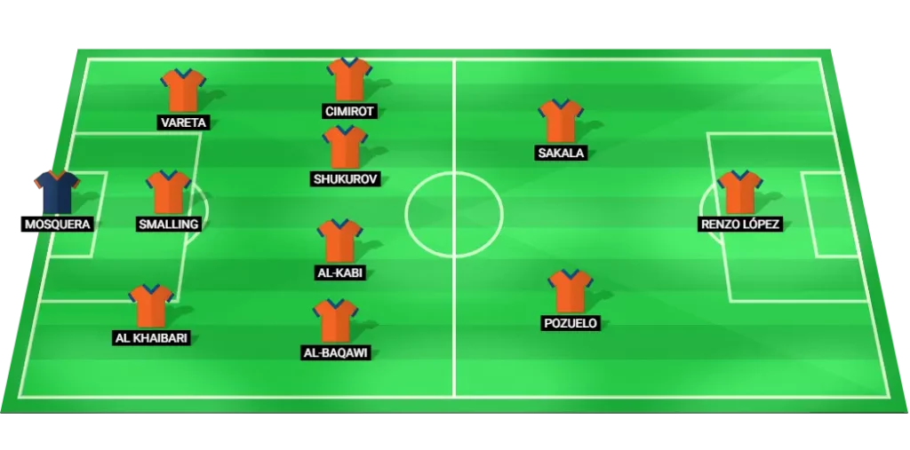 Al Fayha Expected Lineup (3-4-2-1): Orlando Mosquera (GK), Sami Al Khaibari (DF), Chris Smalling (DF), Gabriel Vareta (DF), Nawaf Al-Baqawi (MF), Mohammed Al-Kabi (MF), Otabek Shukurov (MF), Gojko Cimirot (MF), Renzo Pozuelo (MF), Fashion Sakala (MF), Renzo López (FW).