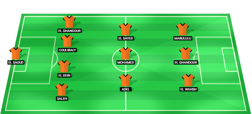 El Saoud (GK), Saleh (DF), El Dein (DF), Coulibaly (DF), El Ghandour (DF), Adel (MF), Mohamed (MF), El Sayed (MF), El Wahsh (FW), El Ghandour (FW), Mabululu (FW)