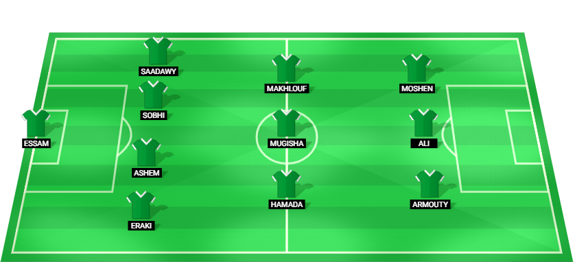 Essam (GK), Eraki (DF), Ashem (DF), Sobhi (DF), Saadawy (DF), Hamada (MF), Mugisha (MF), Makhlouf (MF), Armouty (FW), Ali (FW), Moshen (FW).