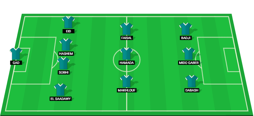Gad (GK), El Saadawy (DF), Sobhi (DF), Hashem (DF), Eid (DF), Makhlouf (MF), Hamada (MF), Faisal (MF), Dabash (FW), Mido Gaber (FW), Badji (FW).