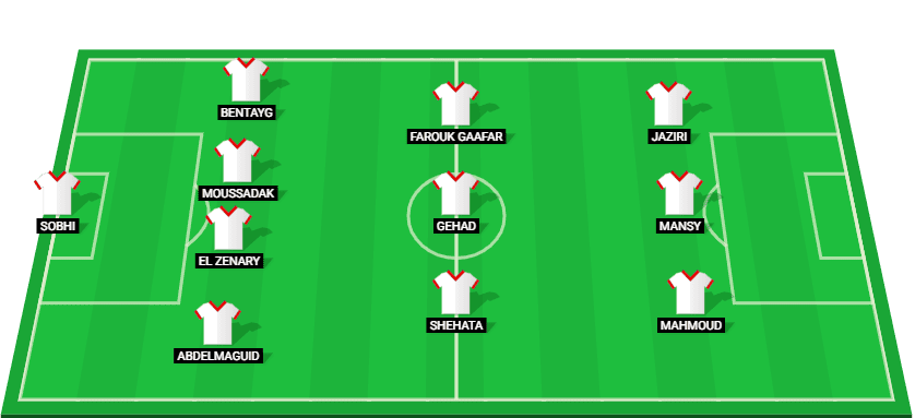 Sobhi (GK), Abdelmaguid (DF), El Zenary (DF), Moussadak (DF), Bentayg (DF), Shehata (MF), Gehad (MF), Farouk Gaafar (MF), Mahmoud (FW), Mansy (FW), Jaziri (FW).