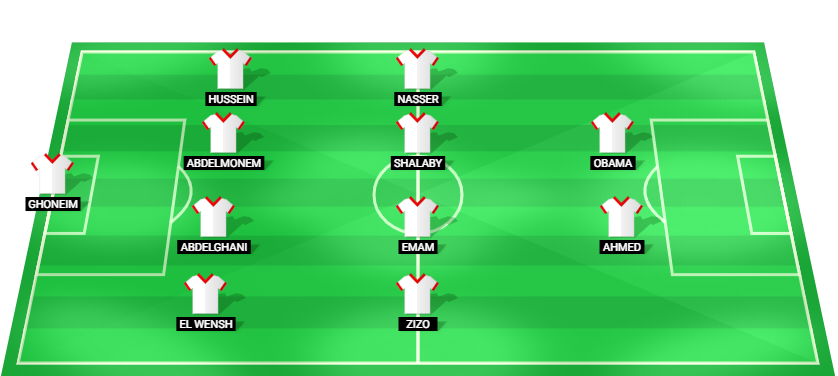 Ghoneim (GK), El Wensh (DF), Abdelghani (DF), Abdelmonem (DF), Hussein (DF), Zizo (MF), Emam (MF), Shalaby (MF), Nasser (MF), Ahmed (FW), Obama (FW).