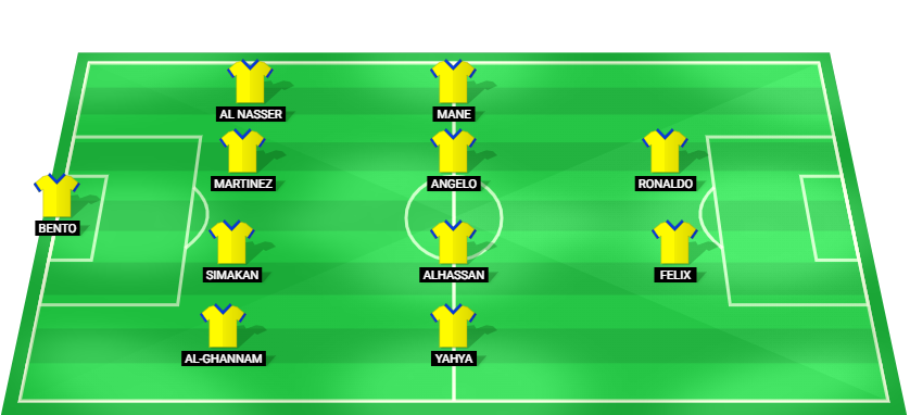 Bento (GK), Al-Ghannam (DF), Simakan (DF), Martinez (DF), Al Nasser (DF), Yahya (MF), Alhassan (MF), Angelo (MF), Mane (MF), Felix (FW), Ronaldo (FW)