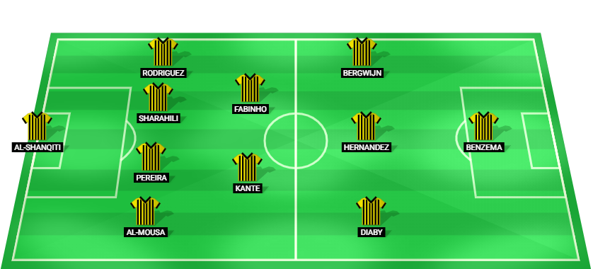 Al-Shanqiti (GK), Al-Mousa (DF), Pereira (DF), Sharahili (DF), Rodriguez (DF), Kante (MF), Fabinho (MF), Diaby (AM), Hernandez (AM), Bergwijn (AM), Benzema (FW)