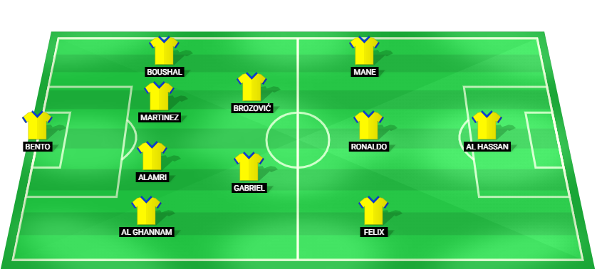 Bento (GK), Al Ghanam (DF), Alamri (DF), Martinez (DF), Boushal (DF), Gabriel (MF), Brozovic (MF), Felix (AM), Ronaldo (AM), Mane (AM), Al Hassan (FW)