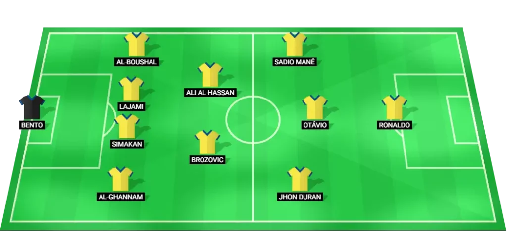 Al-Nassr Expected Lineup: Bento (GK), Al-Ghannam (DF), Simakan (DF), Lajami (DF), Al-Boushal (DF), Brozovic (MF), Ali Al-Hassan (MF), Jhon Duran (MF), Otávio (MF), Sadio Mané (MF), Cristiano Ronaldo (FW)