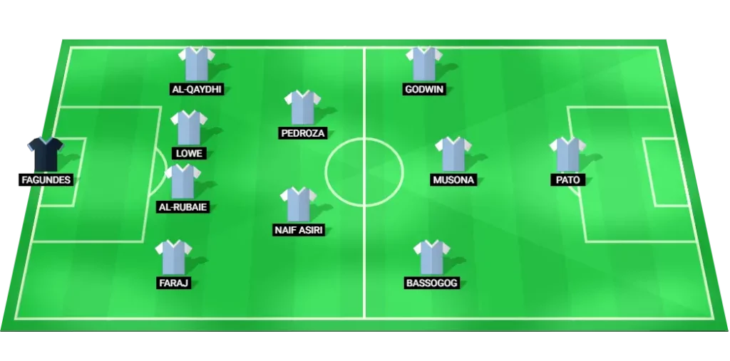 Al Okhdood Expected Lineup: Paulo Vítor Fagundes (GK), Faraj (DF), Al-Rubaie (DF), Lowe (DF), Al-Qaydhi (DF), Naif Asiri (MF), Juan Pedroza (MF), Bassogog (MF), Musona (MF), Godwin (MF), Pato (FW)