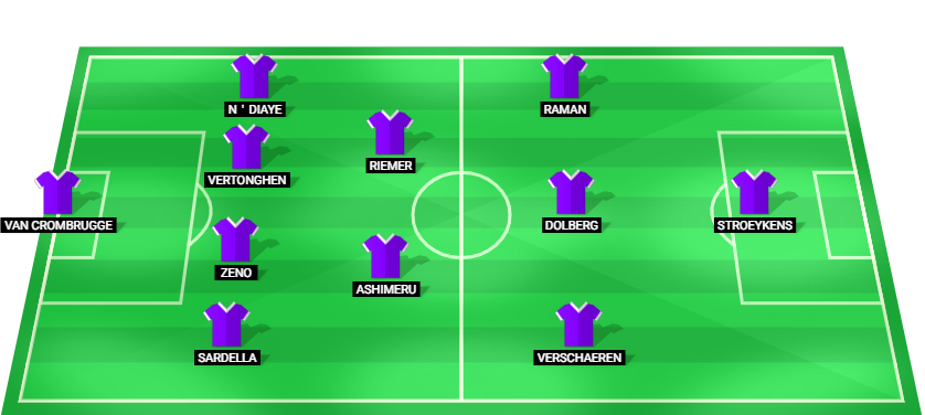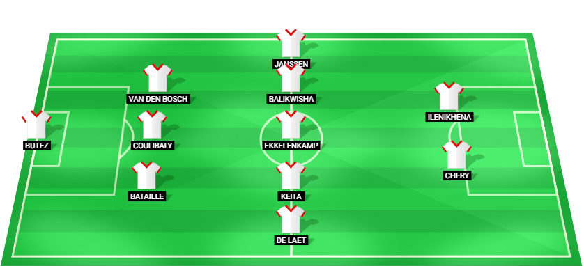 Butez (GK), Bataille (DF), Coulibaly (DF), Van den Bosch (DF), De Laet (MF), Keita (MF), Ekkelenkamp (MF), Balikwisha (MF), Janssen (MF), Chery (FW), Ilenikhena (FW)