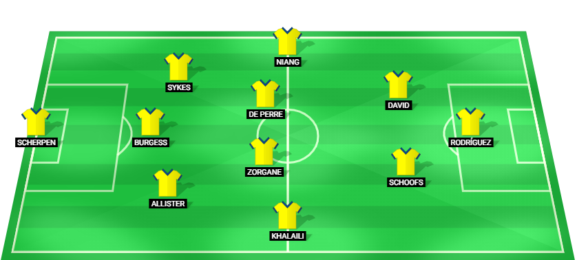 Scherpen (GK), Allister (DF), Burgess (DF), Sykes (DF), Khalaili (MF), Zorgane (MF), De Perre (MF), Niang (MF), Schoofs (AM), David (AM), Rodríguez (FW).