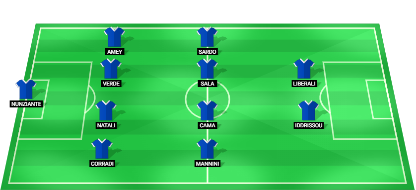 Nunziante (GK), Corradi (DF), Natali (DF), Verde (DF), Amey (DF), Mannini (MF), Cama (MF), Sala (MF), Sardo (MF), Iddrissou (FW), Liberali (FW)