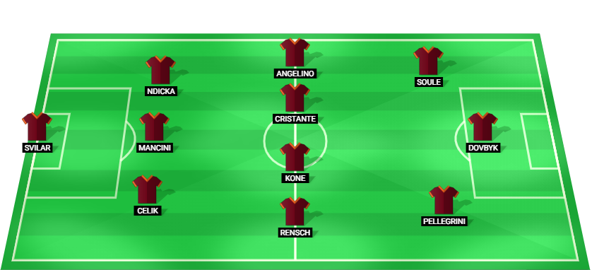 Svilar (GK), Celik (DF), Mancini (DF), Ndicka (DF), Rensch (MF), Kone (MF), Cristante (MF), Angelino (MF), Pellegrini (AM), Soule (AM), Dovbyk (FW)