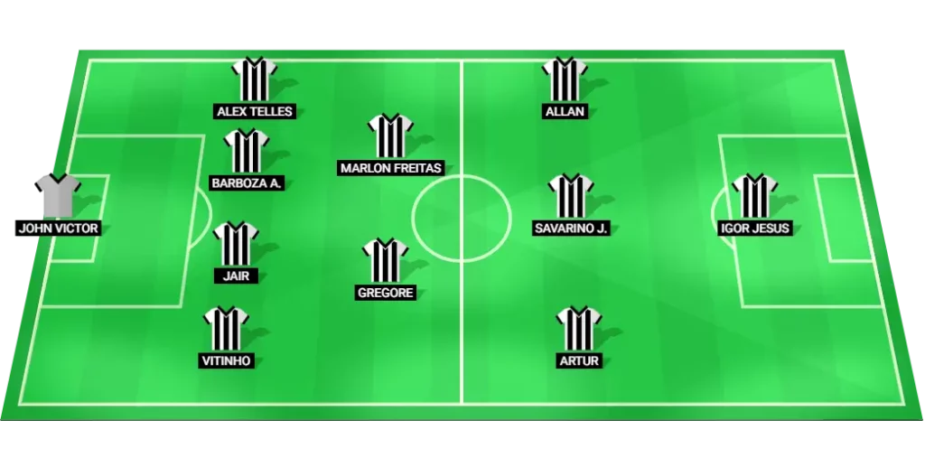 Botafogo are expected to field the same eleven that defeated PSG: John Victor (GK), Vitinho (DF), Jair (DF), Barboza A. (DF), Alex Telles (DF), Gregore (MF), Marlon Freitas (MF), Artur (MF), Savarino J. (MF), Allan (MF), Igor Jesus (FW)