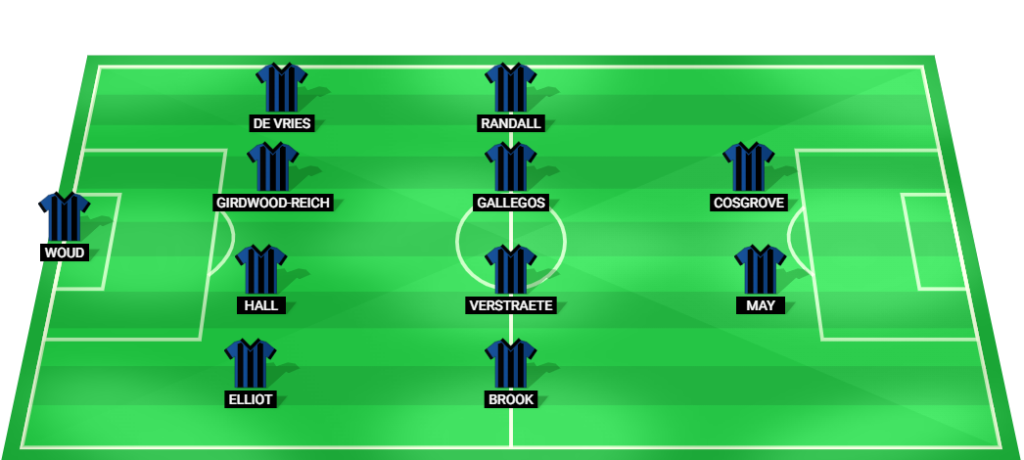 Woud (GK), Elliot (DF), Hall (DF), Girdwood-Reich (DF), De Vries (DF), Brook (MF), Verstraete (MF), Gallegos (MF), Randall (MF), May (FW), Cosgrove (FW).