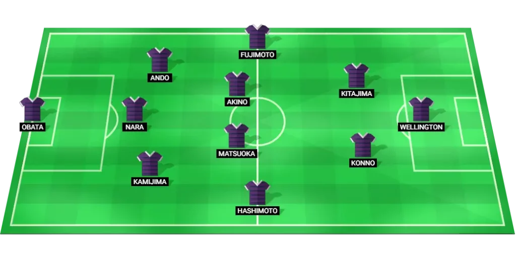 Avispa Fukuoka are expected to field: Obata (GK), Kamijima (DF), Nara (DF), Ando (DF), Hashimoto (MF), Matsuoka (MF), Akino (MF), Fujimoto (MF), Konno (MF), Kitajima (MF), Wellington (FW).