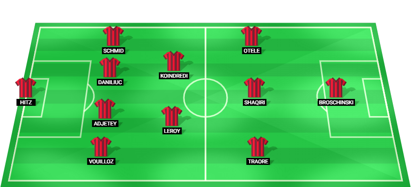 Hitz (GK), Vouilloz (DF), Adjetey (DF), Daniliuc (DF), Schmid (DF), Leroy (MF), Koindredi (MF), Traore (AM), Shaqiri (AM), Otele (AM), Broschinski (FW).