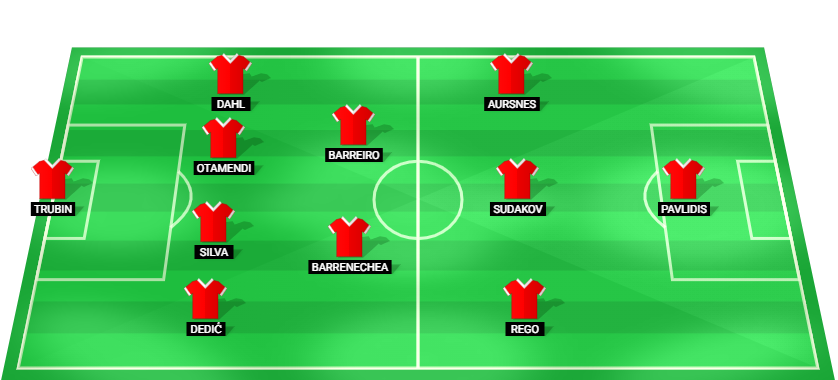 Trubin (GK), Dedić (DF), Silva (DF), Otamendi (DF), Dahl (DF), Barrenechea (MF), Barreiro (MF), Rego (AM), Sudakov (AM), Aursnes (AM), Pavlidis (FW).