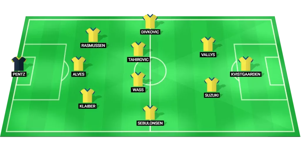 Patrick Pentz (GK), Klaiber (DF), Alves (DF), Rasmussen (DF), Sebulonsen (MF), Wass (MF), Tahirovic (MF), Divkovic (MF), Yuito Suzuki (MF), Nicolai Vallys (MF), Mathias Kvistgaarden (FW)