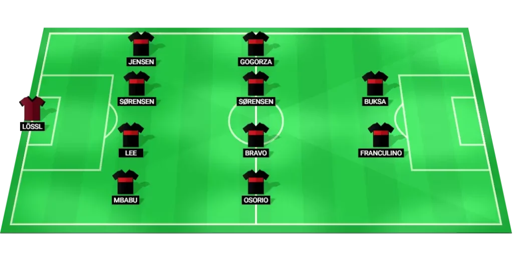 Jonas Lössl (GK), Mbabu (DF), Lee (DF), Sørensen (DF), Jensen (DF), Osorio (MF), Bravo (MF), Sørensen (MF), Gogorza (MF), Franculino (FW), Adam Buksa (FW)