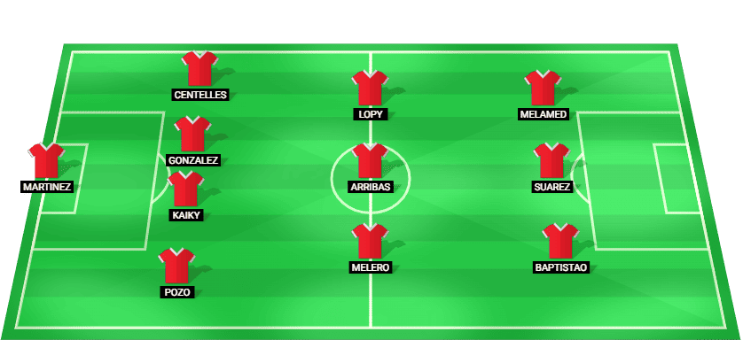 Martinez (GK), Pozo (DF), Kaiky (DF), Gonzalez (DF), Centelles (DF), Melero (MF), Arribas (MF), Lopy (MF), Baptistao (FW), Suarez (FW), Melamed (FW).