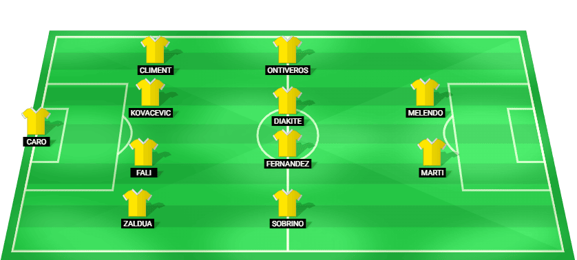 Caro (GK), Zaldua (DF), Fali (DF), Kovacevic (DF), Climent (DF), Sobrino (MF), Fernandez (MF), Diakite (MF), Ontiveros (MF), Marti (FW), Melendo (FW).