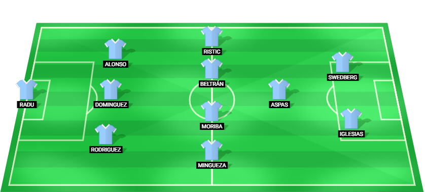 Radu (GK), Rodriguez (DF), Dominguez (DF), Alonso (DF), Mingueza (MF), Moriba (MF), Beltran (MF), Ristic (MF), Aspas (AM), Iglesias (FW), Swedberg (FW)