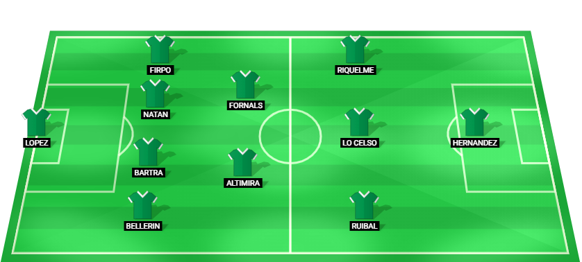 Lopez (GK), Bellerin (DF), Bartra (DF), Natan (DF), Firpo (DF), Altimira (MF), Fornals (MF), Ruibal (AM), Lo Celso (AM), Riquelme (AM), Hernandez (FW)