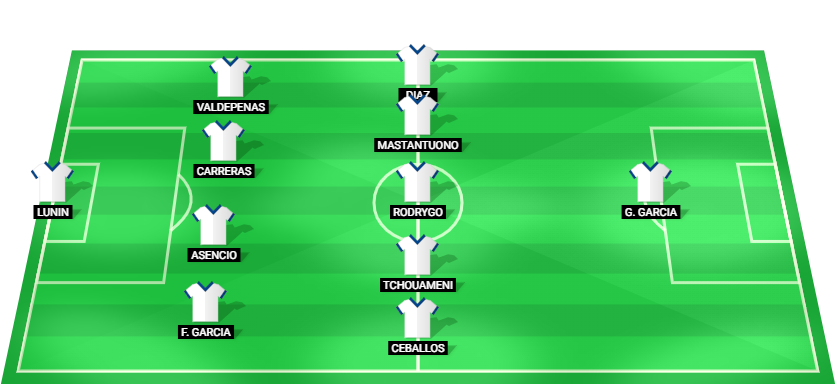 Lunin (GK), F. Garcia (DF), Asencio (DF), Carreras (DF), Valdepenas (DF), Ceballos (MF), Tchouameni (MF), Rodrygo (MF), Mastantuono (MF), Diaz (MF), G. Garcia (FW).