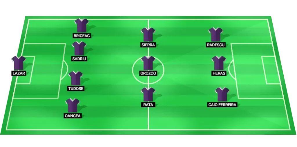 Arges Pitesti will likely opt for a 4-3-3 to match Cluj’s setup, aiming to balance defense and attack: Lazar D. (GK), Oancea D. (DF), Tudose M. (DF), Sadriu L. (DF), Briceag M. (DF), Rata V. (MF), Orozco E. (MF), Sierra R. (MF), Caio Ferreira (FW), Heras N. (FW), Radescu I. (FW)
