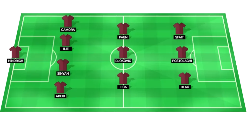 CFR Cluj are expected to deploy their trusted 4-3-3 formation, leveraging their defensive solidity and attacking flair: Hindrich (GK), Abeid (DF), Sinyan (DF), Ilie (DF), Camora (DF), Fica (MF), Djokovic (MF), Paun (MF), Deac (FW), Postolachi (FW), Sfait (FW)