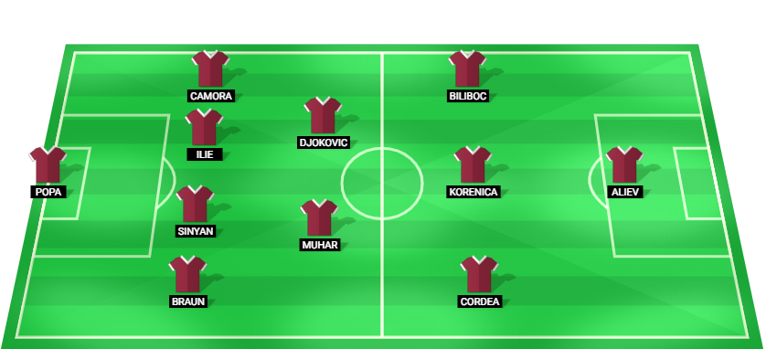Popa (GK), Braun (DF), Sinyan (DF), Ilie (DF), Camora (DF), Muhar (MF), Djokovic (MF), Cordea (MF), Korenica (MF), Biliboc (MF), Aliev (FW).