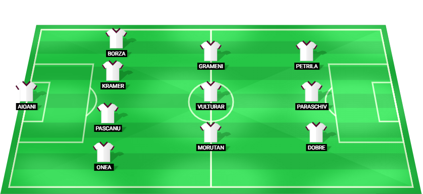 Aioani (GK), Onea (DF), Pascanu (DF), Kramer (DF), Borza (DF), Morutan (MF), Vulturar (MF), Grameni (MF), Dobre (FW), Paraschiv (FW), Petrila (FW).
