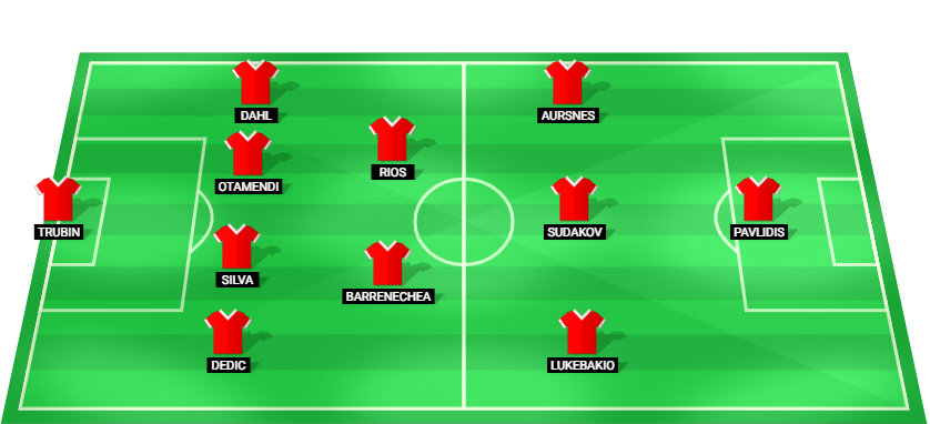 Trubin (GK), Dedic (DF), Silva (DF), Otamendi (DF), Dahl (DF), Barrenechea (MF), Rios (MF), Lukebakio (AM), Sudakov (AM), Aursnes (AM), Pavlidis (FW)