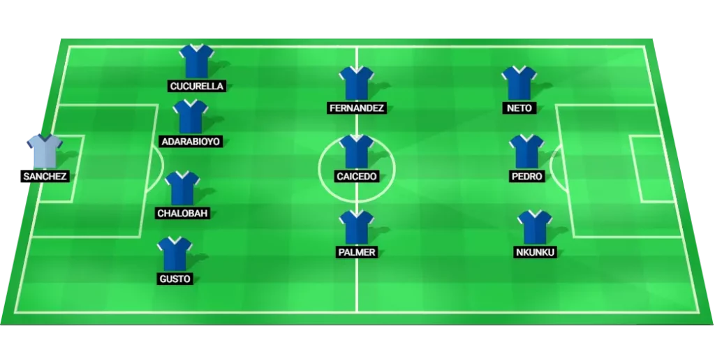 Chelsea Predicted Lineup: R. Sanchez (GK), M. Gusto (DF), T. Chalobah (DF), T. Adarabioyo (DF), M. Cucurella (DF), C. Palmer (MF), M. Caicedo (MF), E. Fernandez (MF), C. Nkunku (FW), J. Pedro (FW), P. Neto (FW)