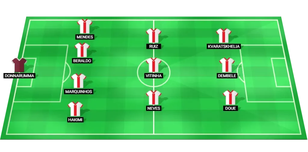 PSG Predicted Lineup: G. Donnarumma (GK), A. Hakimi (DF), Marquinhos (DF), L. Beraldo (DF), N. Mendes (DF), J. Neves (MF), Vitinha (MF), F. Ruiz (MF), D. Doue (FW), O. Dembele (FW), K. Kvaratskhelia (FW)