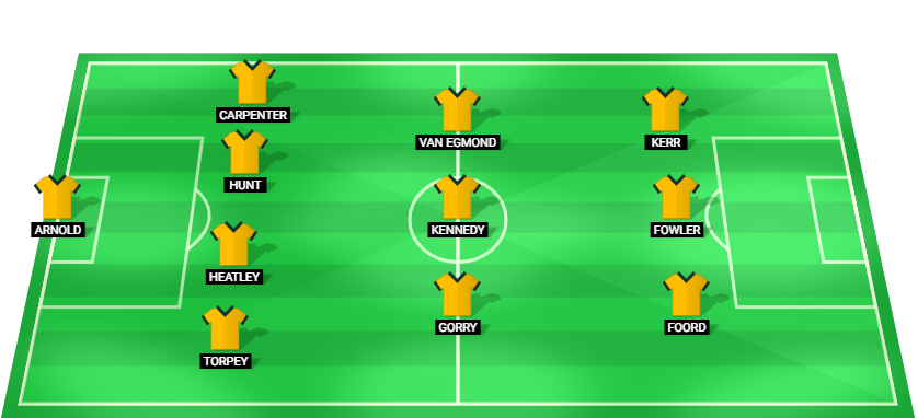 Arnold (GK), Torpey (DF), Heatley (DF), Hunt (DF), Carpenter (DF), Gorry (MF), Kennedy (MF), Van Egmond (MF), Foord (FW), Fowler (FW), Kerr (FW)