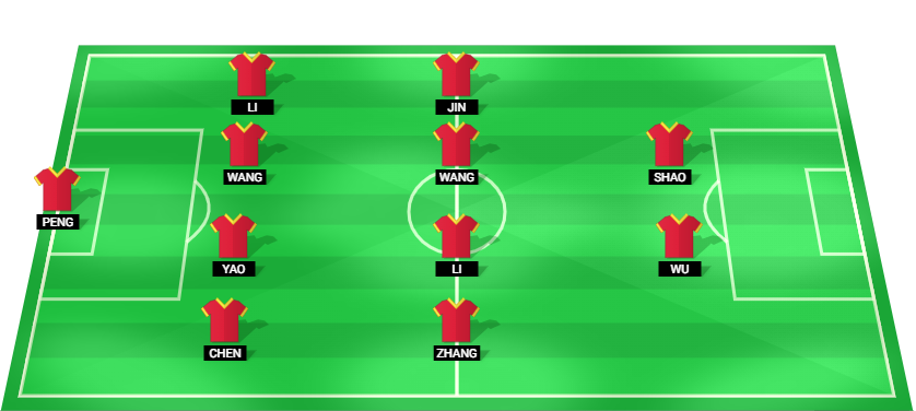 Peng (GK), Chen (DF), Yao (DF), Wang (DF), Li (DF), Zhang (MF), Li (MF), Wang (MF), Jin (MF), Wu (FW), Shao (FW)