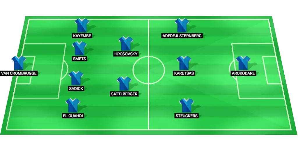 Genk is likely to deploy a 4-2-3-1 formation, focusing on width and midfield control: Van Crombrugge (GK), El Ouahdi (DF), Sadick (DF), Smets (DF), Kayembe (DF), Sattlberger (MF), Hrosovsky (MF), Steuckers (MF), Karetsas (MF), Adedeji-Sternberg (MF), Arokodare (FW).
