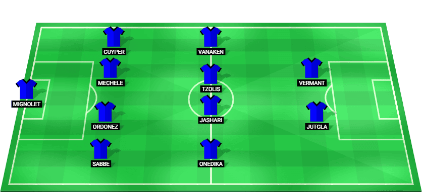 Mignolet (GK), Sabbe (DF), Ordonez (DF), Mechele (DF), Cuyper (DF), Onedika (MF), Jashari (MF), Tzolis (MF), Vanaken (MF), Jutgla (FW), Vermant (FW)