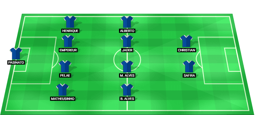 Pasinato (GK), Matheusinho (DF), Pelae (DF), Empereur (DF), Henrique (DF), B. Alves (MF), M. Alves (MF), Jader (MF), Alberto (MF), Safira (FW), Christian (FW).
