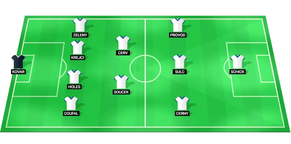 Czech Republic Predicted Lineup: Kovar (GK), Coufal (DF), Holes (DF), Krejci (DF), Zeleny (DF), Soucek (MF), Cerv (MF), Cerny (MF), Sulc (MF), Provod (MF), Schick (FW)