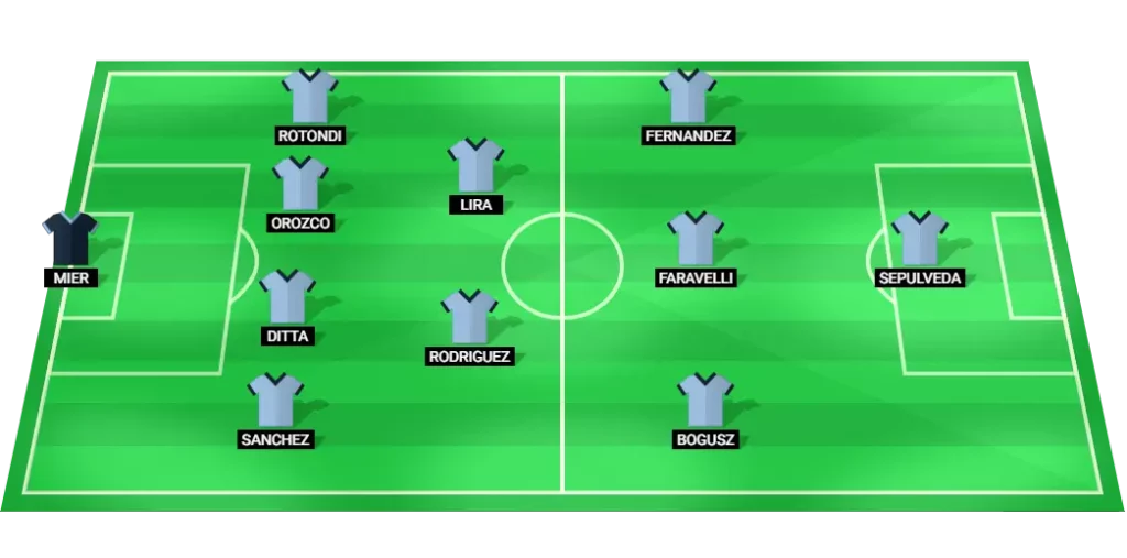 Cruz Azul Predicted Lineup: Mier (GK), Sanchez (DF), Ditta (DF), Orozco (DF), Rotondi (DF), Rodriguez (MF), Lira (MF), Bogusz (MF), Faravelli (MF), Fernandez (MF), Sepulveda (FW)