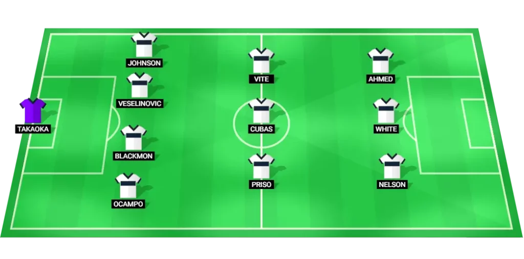 Vancouver Whitecaps Predicted Lineup: Takaoka (GK), Ocampo (DF), Blackmon (DF), Veselinovic (DF), Johnson (DF), Priso (MF), Cubas (MF), Vite (MF), Nelson (FW), White (FW), Ahmed (FW)