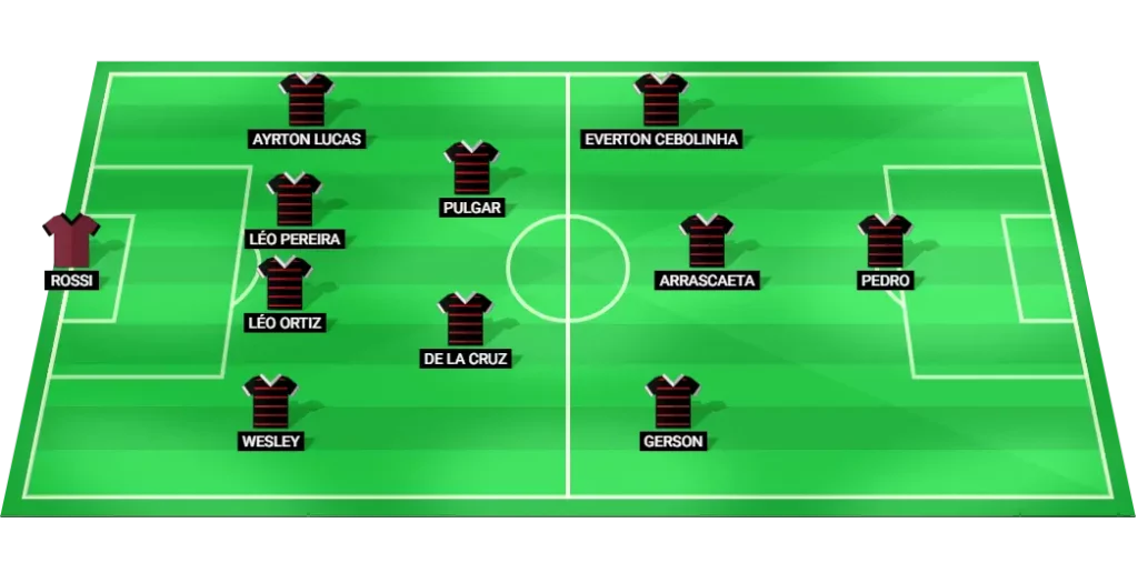 Flamengo Starting Lineup (4-2-3-1): Rossi (GK), Wesley (DF), Léo Ortiz (DF), Léo Pereira (DF), Ayrton Lucas (DF), Pulgar (MF), De la Cruz (MF), Gerson (MF), Arrascaeta (MF), Everton Cebolinha (MF), Pedro (FW)