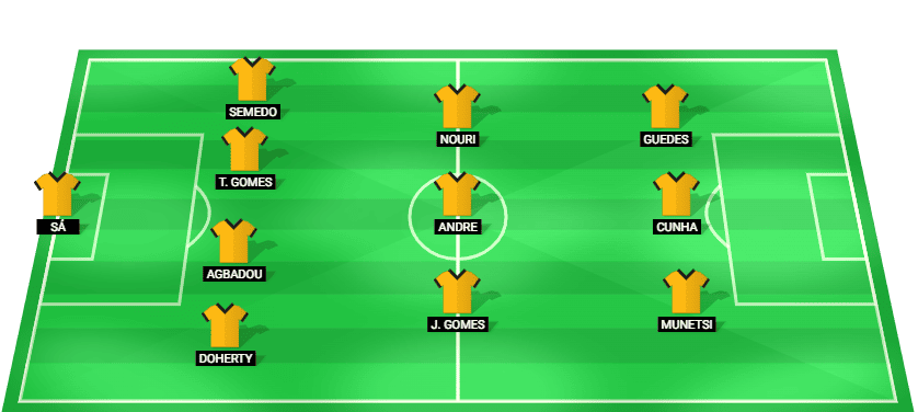 Sa (GK), Doherty (DF), Agbadou (DF), T. Gomes (DF), Semedo (DF), J. Gomes (MF), Andre (MF), Nouri (MF), Munetsi (FW), Cunha (FW), Guedes (FW)