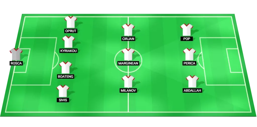 Dinamo Bucuresti Predicted Lineup (4-3-3): Rosca A. (GK), Sivis M. (DF), Boateng K. (DF), Kyriakou C. (DF), Oprut R. (DF), Milanov G. (MF), Marginean I. (MF), Cirjan C. (MF), Abdallah H. (FW), Perica S. (FW), Pop A. (FW)