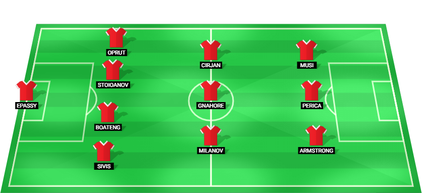 Epassy (GK), Sivis (DF), Boateng (DF), Stoioanov (DF), Oprut (DF), Milanov (MF), Gnahore (MF), Cirjan (MF), Armstrong (FW), Perica (FW), Musi (FW)