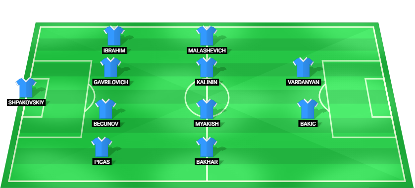 Shpakovskiy (GK), Pigas (DF), Begunov (DF), Gavrilovich (DF), Ibrahim (DF), Bakhar (MF), Myakish (MF), Kalinin (MF), Malashevich (MF), Bakic (FW), Vardanyan (FW).